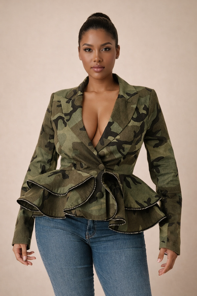 Attention!! Nothing But salutes as you walk by in this statement jacket. Camo jacket with peplum with zipper trim detail and long sleeves.