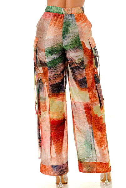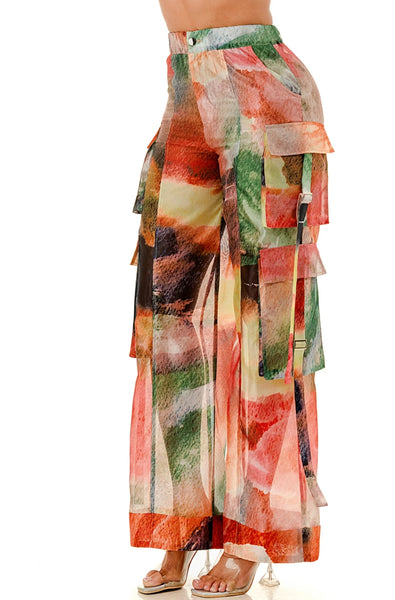Turn every step into a statement. The Color Splash Cargo brings playful energy with its bold watercolor print and lightweight organza flow. Featuring layered cargo pockets with a sheer twist, these pants strike the perfect balance between streetwear edge and flirty chic. Pair them with heels for a glam night out or sneakers for a carefree day look—either way, you’ll be serving major color and confidence.