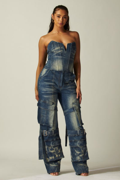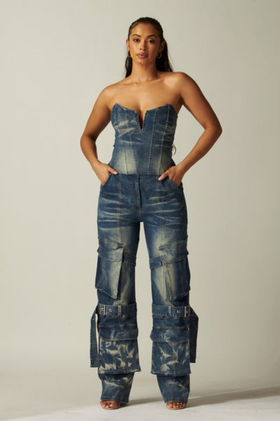 The Buckle Up Babe Set is a two-piece denim power statement featuring a structured strapless corset top with a sculpted plunge neckline that enhances and defines your shape. The contour seams create a snatched silhouette while the washed denim finish adds that effortlessly luxe edge.